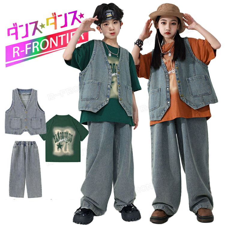 ダンス衣装 キッズ デニムセット ベスト ロングパンツ 男の子 女の子 ガールズ 韓国 hiphop セットアップ 演出服 応援団 練習着 120 180