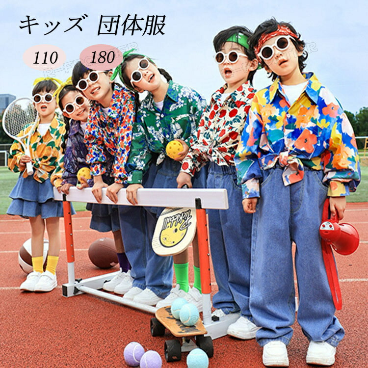 ダンス衣装 キッズ ユニセックス 柄シャツ デニムパンツ トップス ユニセックス ステージ衣装 子供 練習着 韓国 発表会 人気 おしゃれ 韓国 かっこいい 派手 110-180