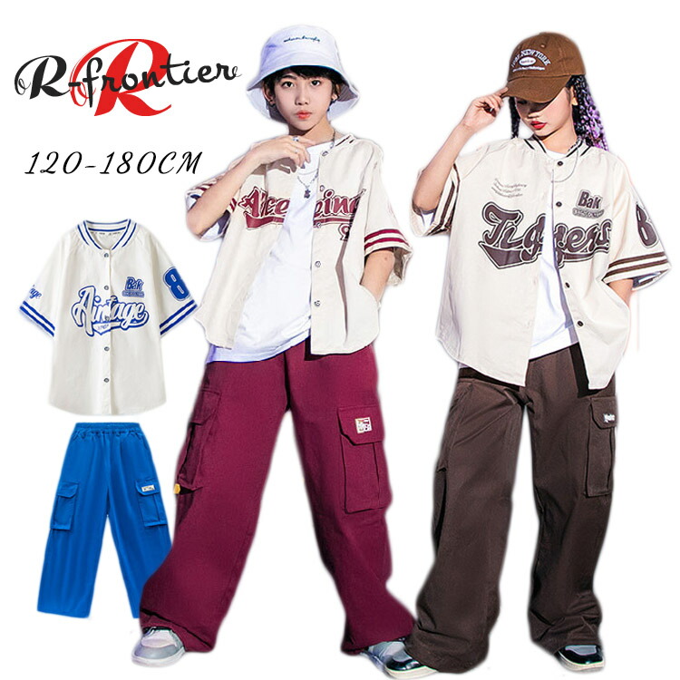 ダンス 衣装 ヒップホップ キッズ 青 ベースボールシャツ セットアップ 茶色パンツ 女の子 男の子 韓国 -衣装 かっこいい ジュニア 子供 イベント 発表会 演出服 応援 1