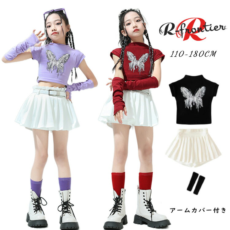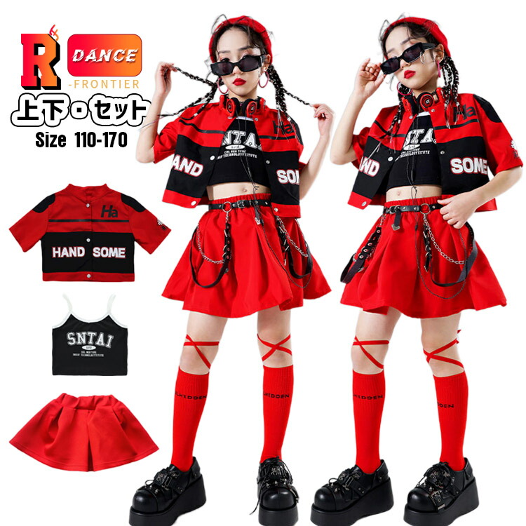 キッズ ダンス衣装 セットアップ へそ出し トップス 女の子 かっこいい 赤ジャケット スカート 半袖 韓国 -衣装 ヒップホップ ジャズダンス 団体 演出服 応援団 イベント110-170
