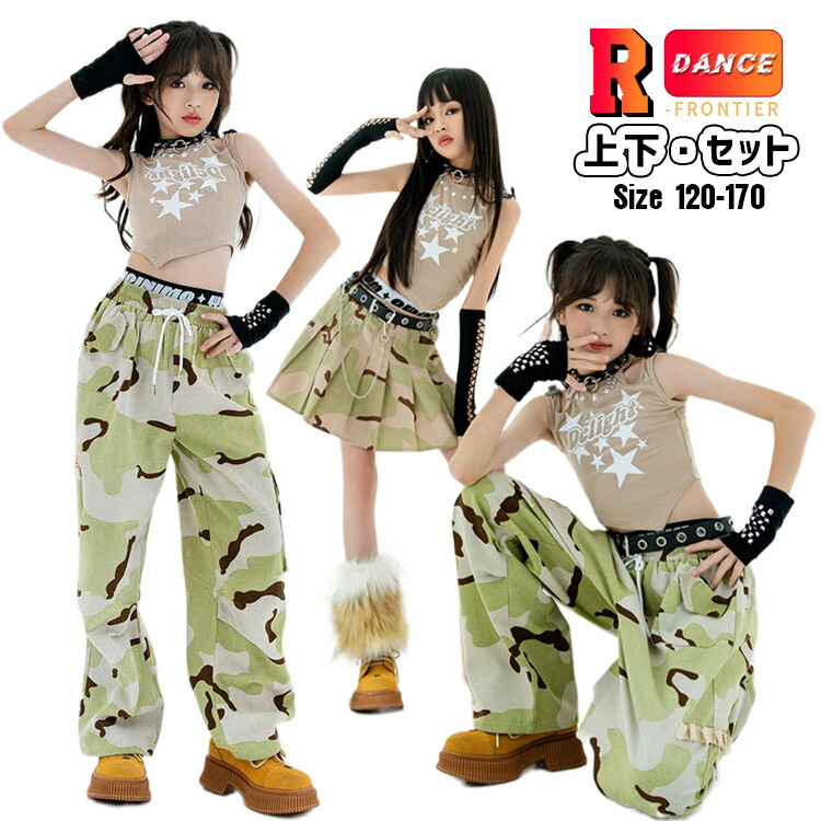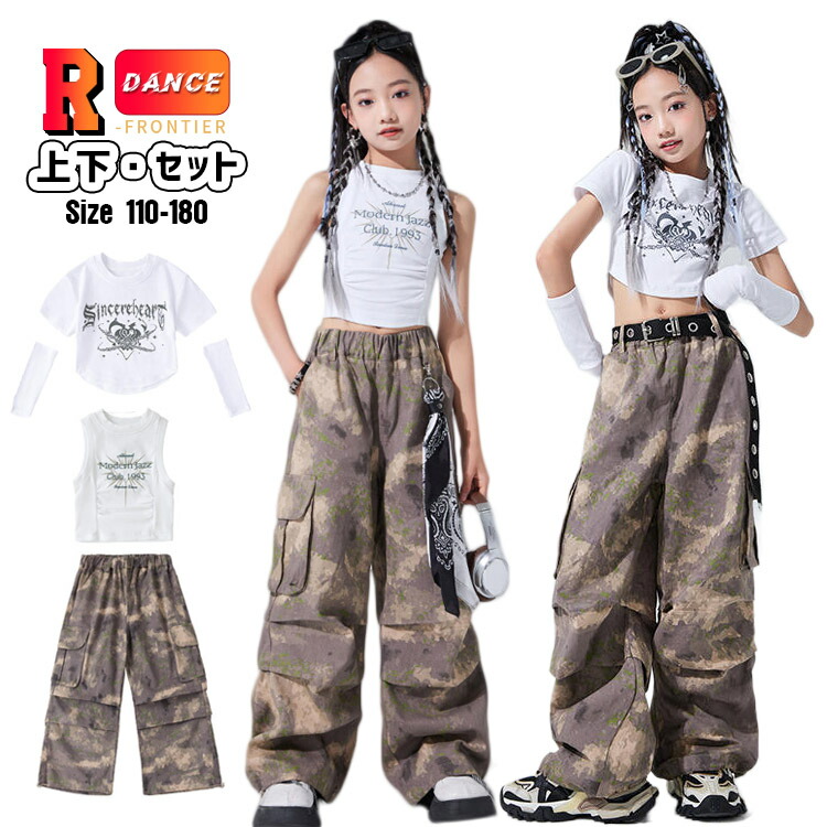 ダンス トップス へそ出し キッズ 女の子 迷彩パンツ かっこいい カーゴパンツ 韓国 -衣装 ヒップホップ ジャズダンス 団体 演出服 応援団 イベント 110-180