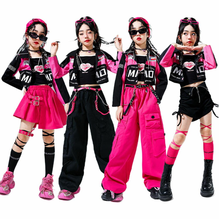 ダンス トップス へそ出し キッズ 女の子 かっこいい ローズ スカート 半袖 ジャケット 韓国 k-pop衣装 ヒップホップ ジャズダンス 団体 HIPHOP 演出服 応援団 イベント110-170