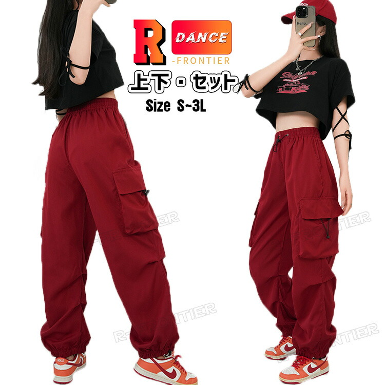 レディース 赤 カーゴパンツ へそ出し パンツ ダンス衣装 セットアップ ジャズ ヒップホップ 演出服 ダンスへそ出し トップス カーゴパンツ