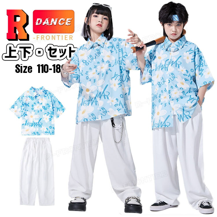 ダンス衣装 キッズ セットアップ 柄シャツ 白パンツ ダンストップス HIPHOP ユニセックス ステージ衣装 子供 練習着 韓国 発表会 人気 おしゃれ 韓国 かっこいい 派手 110-180cm