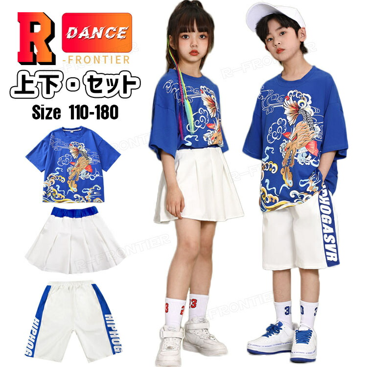 ダンス衣装 キッズ セットアップ 龍柄 ブルー tシャツ 白スカート ハーフパンツ ゆったり ジャズダンス 韓国 hiphop 演出服 応援団 練習着 110 180