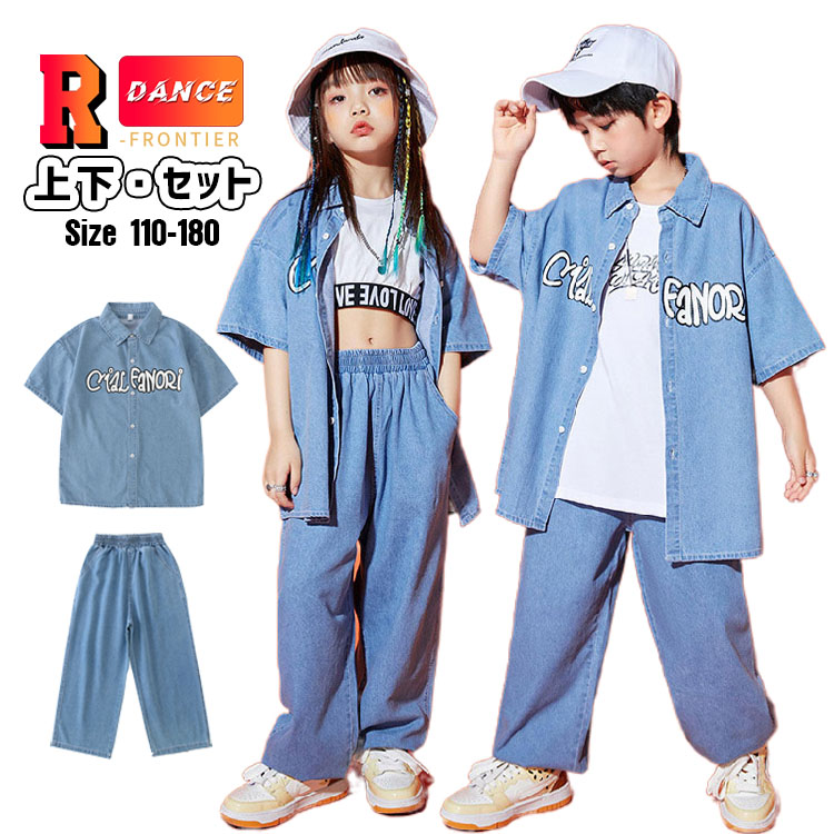ダンス衣装 セットアップ キッズ デニムシャツ 女の子 男の子 かっこいい デニムパンツ ヒップホップ 子供服 ジャズダンス ステージ衣装 練習着 おしゃれ イベント 110-180