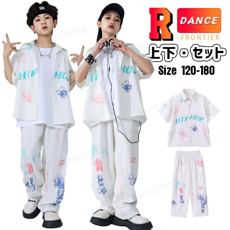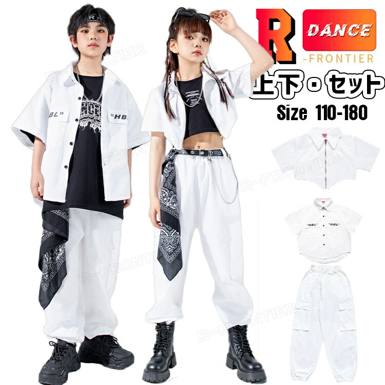 ダンス衣装 キッズ 上下セット 白 半袖シャツ 白パンツ ユニセックス 韓国 ヒップホップ ジャズ hiphop 演出服 応援団 練習着 120 180