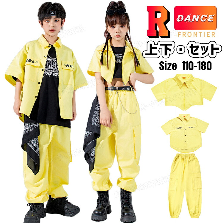 ダンス衣装 キッズ セットアップ 黄色 カーゴパンツ 半袖 トップス ヒップホップ ジャズダンス 女の子 ガールズ カッコイイ 演出服 応援団 ステージ衣装 110-180