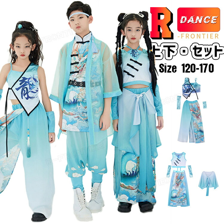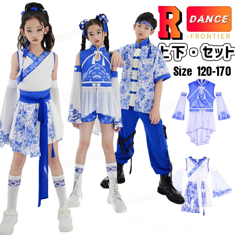 ダンス衣装 キッズ セットアップ 中華風 染付 ブルー ヒップホップ ジャズダンス 女の子 ガールズ カッコイイ 演出服 応援団 ステージ衣装 120-170