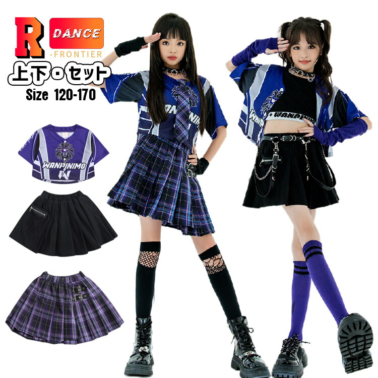 ダンス トップス へそ出し キッズ 女の子 ベースボールシャツ かっこいい 黒スカート チェック柄スカート 韓国 k-pop衣装 ヒップホップ ジャズダンス 演出服 応援団 イベント120-170cm