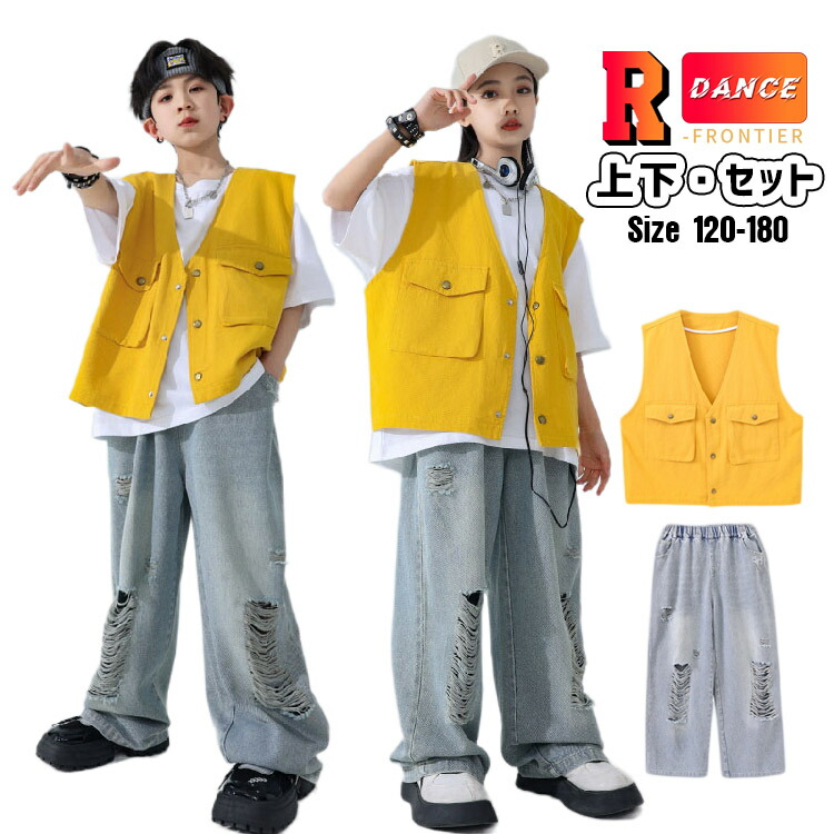 ダンス衣装 ヒップホップ キッズ デニムパンツ ベスト セットアップ 女の子 男の子 かっこいい 半袖 ワイドパンツ 韓国 ジャズダンス 団体 演出服 応援団 イベント 120-180