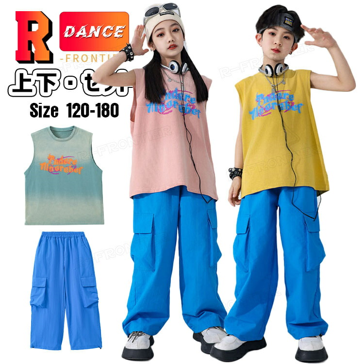 ダンス衣装 キッズ 上下セット カーゴパンツ 袖なし tシャツ グラデーション トップス ジャズダンス ユニセックス 韓国 ヒップホップ ジャズ hiphop 演出服 応援団 練習着 120 180