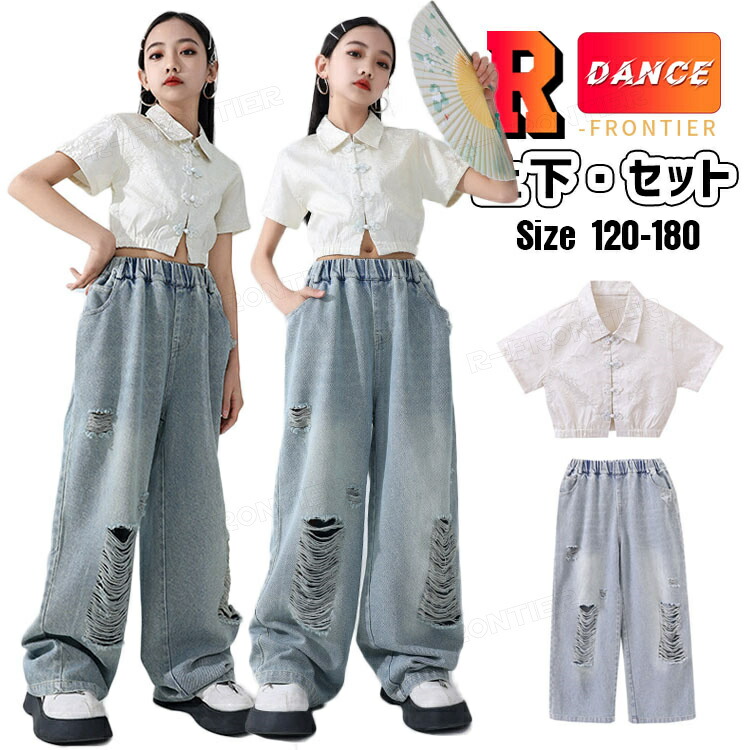 ダンス衣装 キッズ 上下セット デニム ダメージパンツ へそ出し トップス ジャズダンス ガールズ 韓国 ヒップホップ ジャズ 演出服 応援団 練習着 120 180