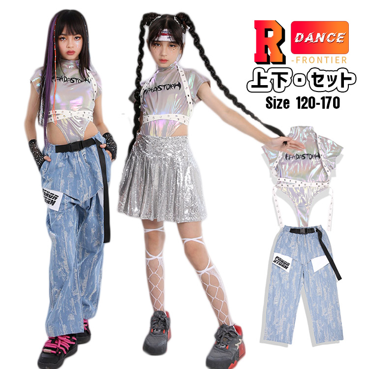 ダンス トップス へそ出し キッズ 女の子 デニムパンツ かっこいい キラキラ スカート セットアップ 韓国 -衣装 ヒップホップ ジャズダンス 演出服 応援団 イベント120-170