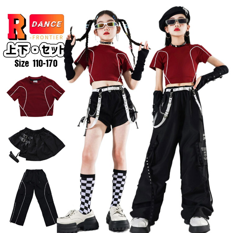 ダンス トップス へそ出し キッズ 女の子 赤 黒 セットアップ 赤 トップス かっこいい ワイドパンツ スカート 韓国 -衣装 ヒップホップ ジャズダンス 演出服 イベント110-170