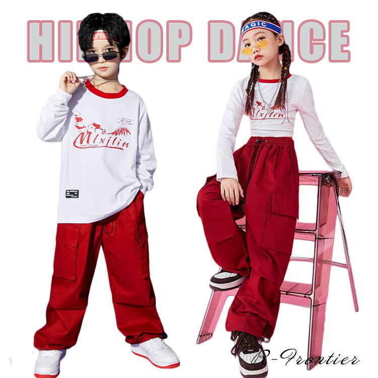 キッズ ダンス衣装 赤パンツ ヒップホップ へそ出し トップス 女の子 男の子 セットアップ 長袖 かっこいい ジュニア 子供 HIPHOP 韓国 k-pop衣装 イベント 110-180cm