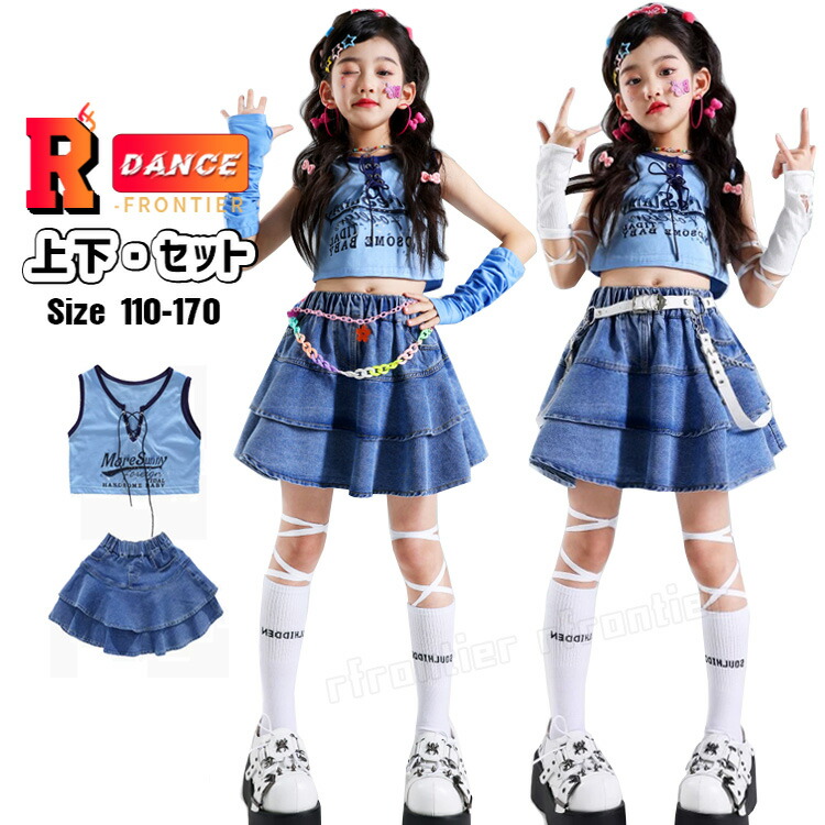 ダンス トップス へそ出し キッズ 女の子 デニムパンツ かっこいい キラキラ スカート セットアップ 韓国 k-pop衣装 ヒップホップ ジャズダンス 演出服 応援団 イベント120-170cm