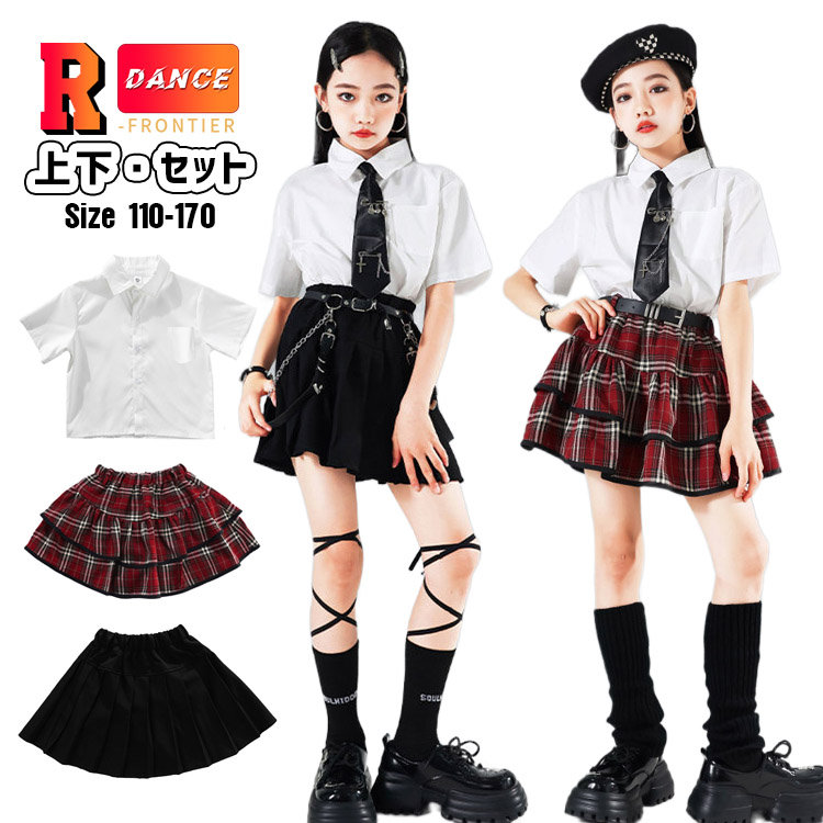 キッズダンス衣装 セットアップ 白シャツ 黒スカート 女の子 かっこいい チェック柄スカート チアダンス 韓国 -衣装 ヒップホップ ジャズダンス 演出服 応援団 イベント110-170
