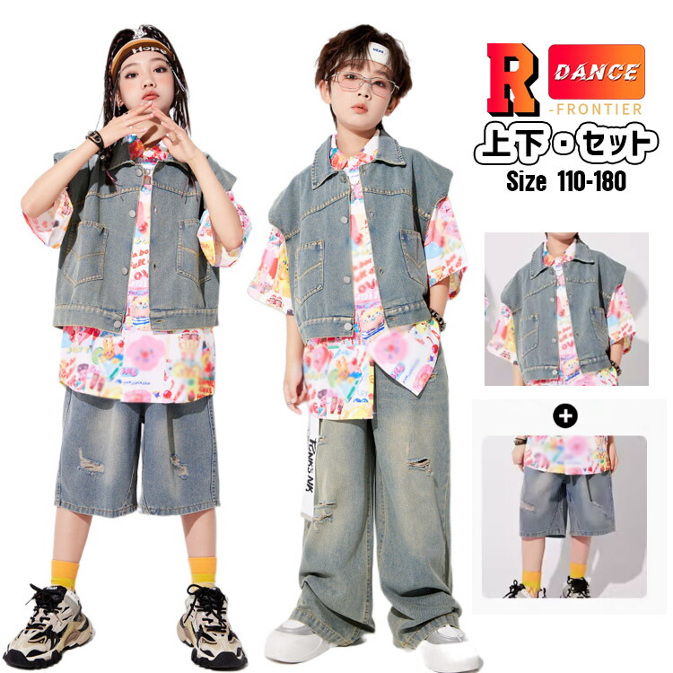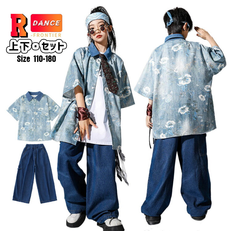 キッズダンス衣装 セットアップ デニムパンツ 女の子 花柄シャツ 男の子 かっこいい ヒップホップ ワイドパンツ 韓国 -衣装 ジャズダンス 演出服 応援団 イベント110-180