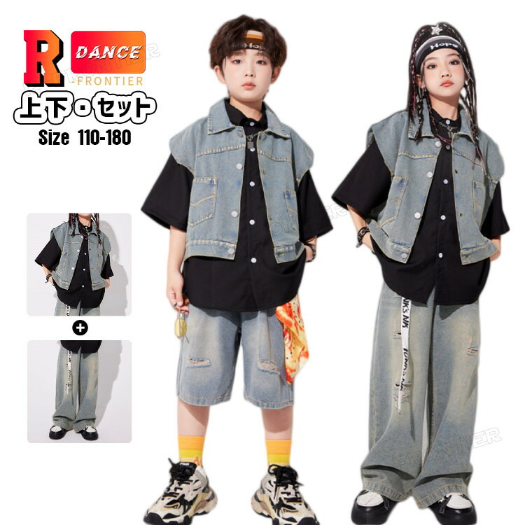 キッズダンス衣装 セットアップ デニムパンツ 女の子 デニムベスト 男の子 かっこいい ヒップホップ ワイドパンツ 韓国 -衣装 ジャズダンス 演出服 応援団 イベント110-180