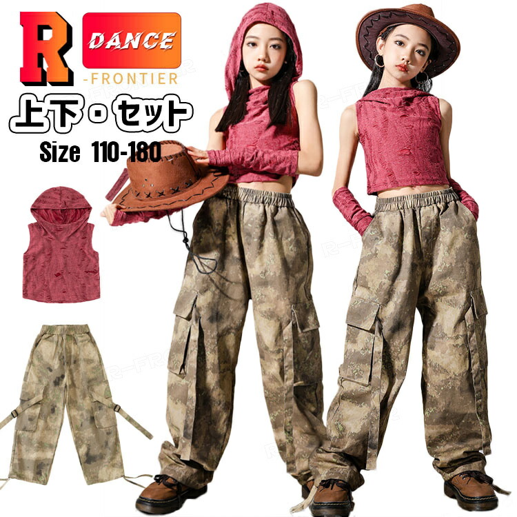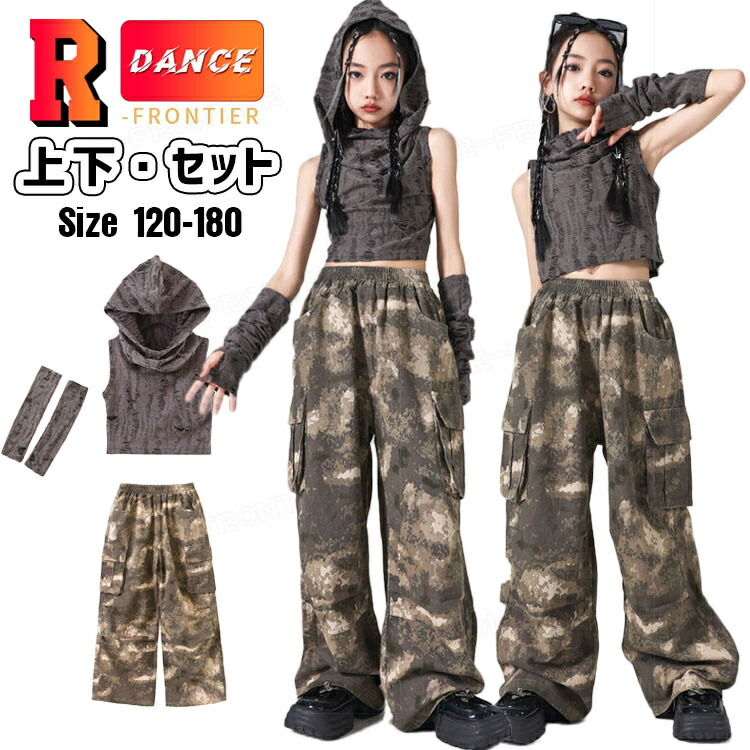 ジャズダンス 衣装 キッズ セットアップ へそ出しトップス フード付き ヒップホップ 迷彩パンツ カーゴパンツ ジャズダンス 女の子 ガールズ 演出服 応援団 ステージ衣装 120-180