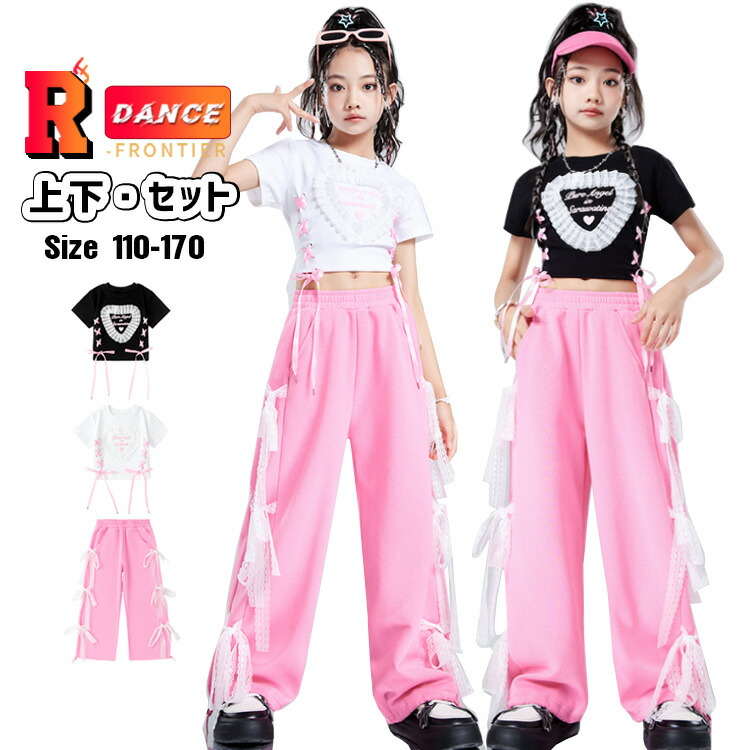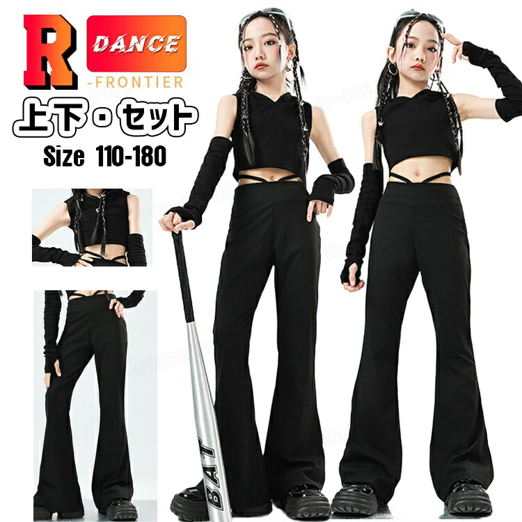 ジャズダンス 衣装 キッズ セットアップ へそ出しトップス ラップパンツ 黒 tシャツ ジャズダンス 女の子 ガールズ 演出服 応援団 ステージ衣装 110-180