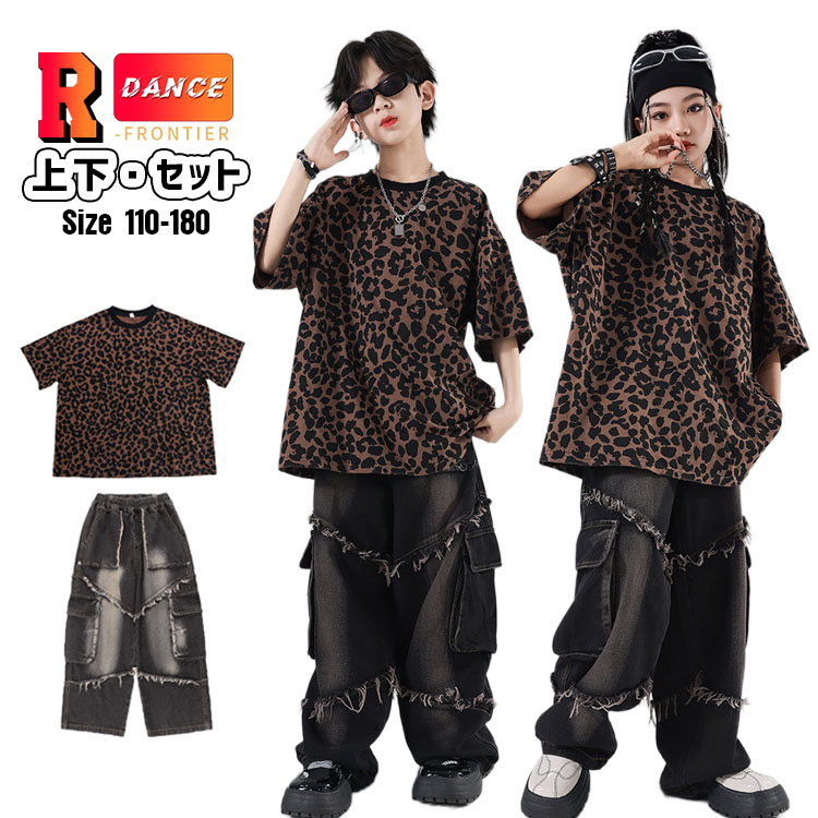 キッズダンス衣装 セットアップ ヒョウ柄tシャツ デニムパンツ 女の子 男の子 かっこいい ヒップホップ ワイドパンツ 韓国 k-pop衣装 ジャズダンス 演出服 応援団 イベント110-180cm