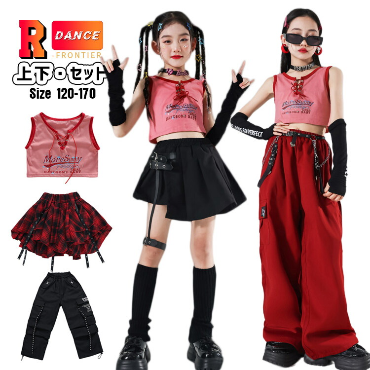 キッズダンス衣装 韓国 かっこいい 黒 トップス レッド スカート カーゴ服 女の子 演出服 ジュニア 子供 hiphop 発表会 演出服 応援 110 120 130 140 150 160 170