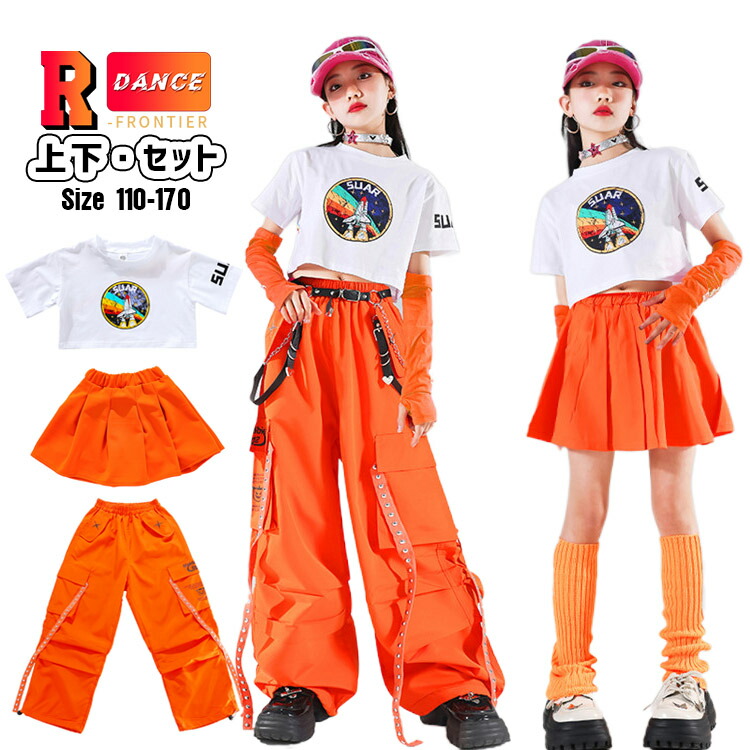 キッズダンス衣装 セットアップ 橙パンツ 女の子 かっこいい スカート ヒップホップ ワイドパンツ チアダンス 韓国 k-pop衣装 ジャズダンス 演出服 応援団 イベント110-170cm