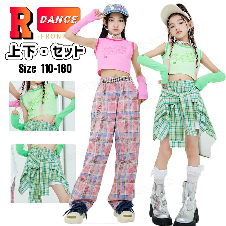 ダンス衣装 キッズ セットアップ へそ出しトップス チェック柄 長パンツ キュロット ジャズダンス ガールズ 韓国 ヒップホップ hiphop 演出服 応援団 練習着 110-180cm