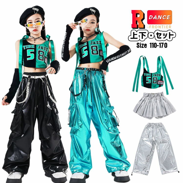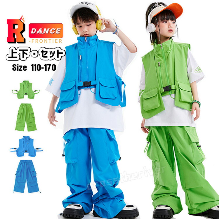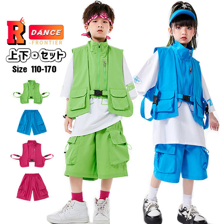 緑 青 カーゴベスト 2色 ダンス 衣装 ヒップホップ キッズ セットアップ 半袖シャツ パンツ ジャズダンス チアガール 韓国 ヒップホップ hiphop 応援団 練習着