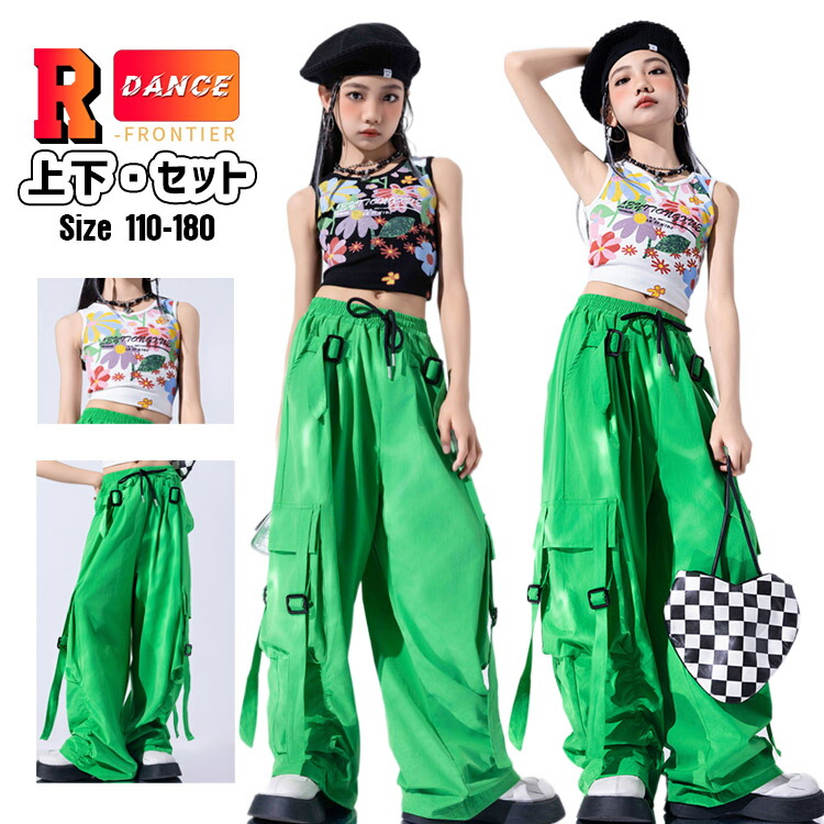 キッズダンス衣装 へそ出し トップスセットアップ 緑パンツ 女の子 かっこいい ヒップホップ ワイドパンツ チアダンス 韓国 -衣装 ジャズダンス 演出服 応援団 イベント110-180