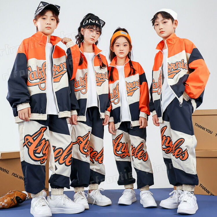 キッズ ダンス衣装 スポーツセット チームお揃い 長袖 コート オレンジ ズボン ヒップホップ 団体 HIPHOP ダンス衣装 ジュニア イベント 発表会 演出服 応援団 110 170