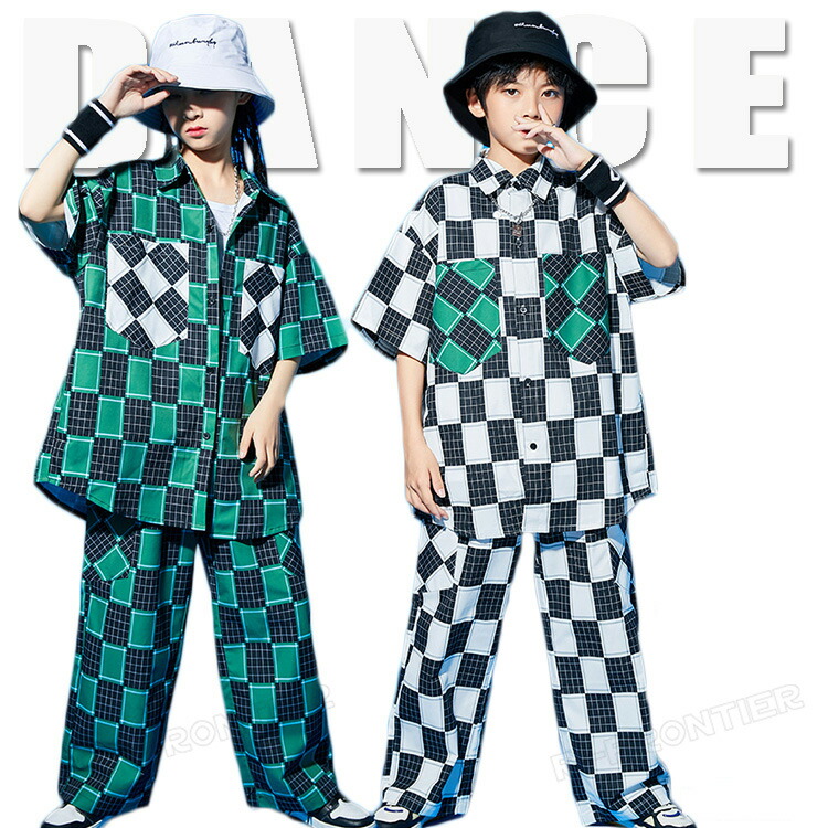 ヒップホップ キッズ ダンス 衣装 女の子 男の子 チェック柄 緑 白 セットアップ 子供 - 衣装 ダンスウェア 大きいサイズ 110 120 130 140 150 160 170 180