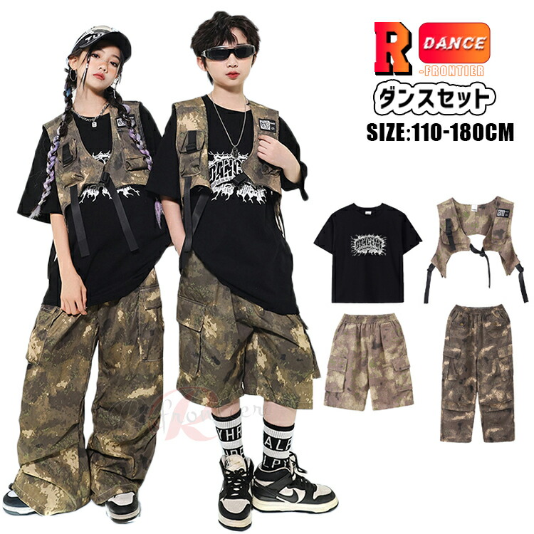 ダンス衣装 キッズ パンツ キッズ カーゴパンツ 迷彩 ベスト 半ズボン ダンスセット ジャズ ダンス衣装 女の子 110 120 130 140 150 160 170