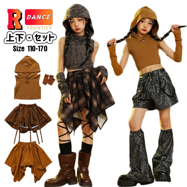 キッズ ダンス衣装 へそ出し トップス 女の子 茶色トップス セットアップ 袖なし キラキラ かっこいい 黒 短パンツ ヒップホップ 韓国 -衣装 演出服 応援団 イベント110-170