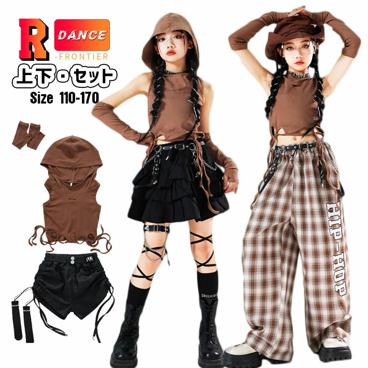 キッズ ダンス衣装 茶色 セットアップ へそ出し トップス 女の子 袖なし かっこいい ワイドパンツ ヒップホップ 韓国 -衣装 ジャズダンス 演出服 応援団 イベント110-170