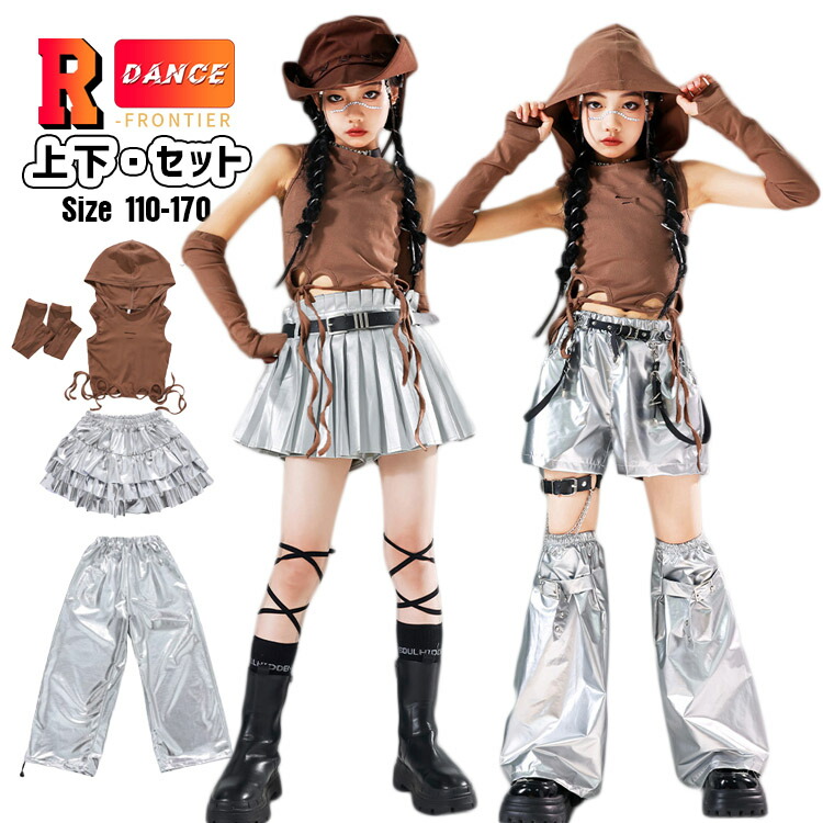キッズダンス衣装 シルバーパンツ セットアップ へそ出し トップス 女の子 茶色 スカート かっこいい ワイドパンツ ヒップホップ 韓国 -衣装 演出服 応援団 イベント110-170