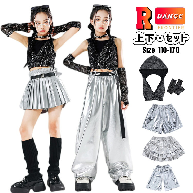 シルバーパンツ キッズ ダンス衣装 セットアップ へそ出し トップス 女の子 袖なし キラキラ かっこいい ワイドパンツ ヒップホップ 韓国 -衣装 演出服 応援団 イベント110-170