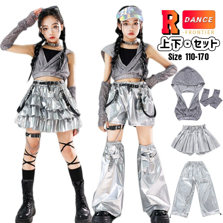 キッズダンス衣装 シルバー色 セットアップ へそ出し トップス 女の子 キラキラ パンツ かっこいい ワイドパンツ ヒップホップ 韓国 -衣装 袖なし 演出服 応援団 イベント110-170