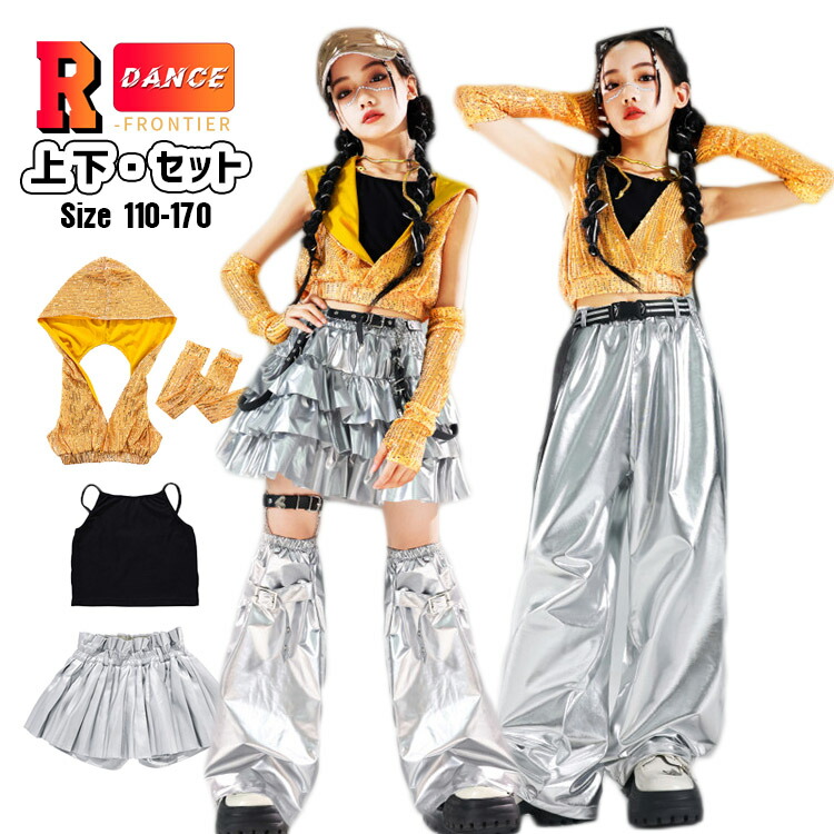 キッズダンス衣装 シルバーパンツ セットアップ へそ出し トップス 女の子 袖なし 黄色 キラキラ かっこいい ワイドパンツ ヒップホップ 韓国 -衣装 演出服 応援団 イベント110-170