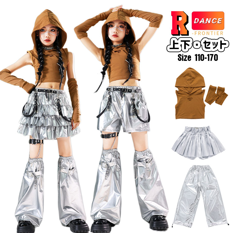 キッズダンス衣装 シルバーパンツ セットアップ へそ出し トップス 女の子 茶色 スカート かっこいい ワイドパンツ ヒップホップ 韓国 k-pop衣装 演出服 応援団 イベント110-170cm