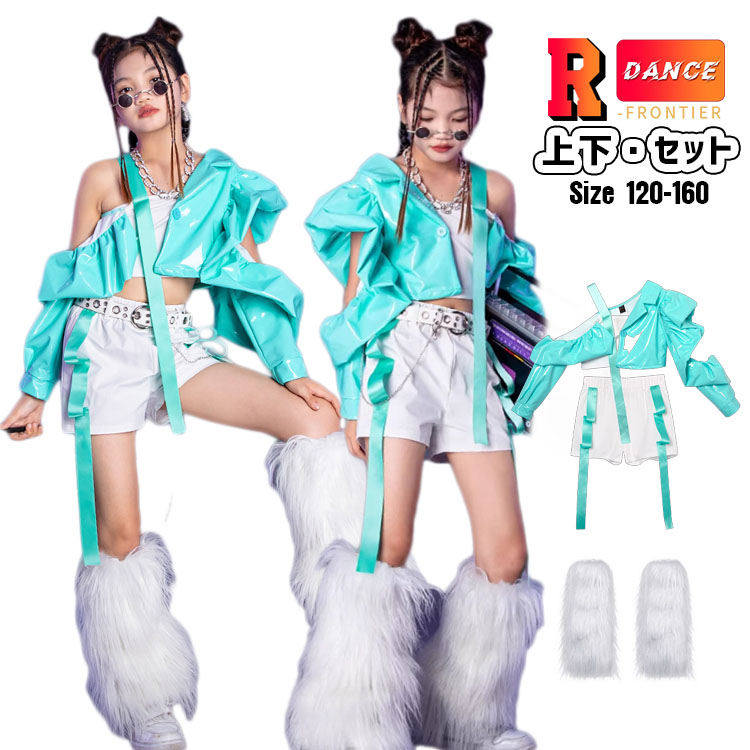 キッズ ダンス衣装 セットアップ へそ出し トップス 女の子 グリーン 肩出し かっこいい ヒップホップ レッグウォーマー 韓国 -衣装 演出服 応援団 イベント120-160