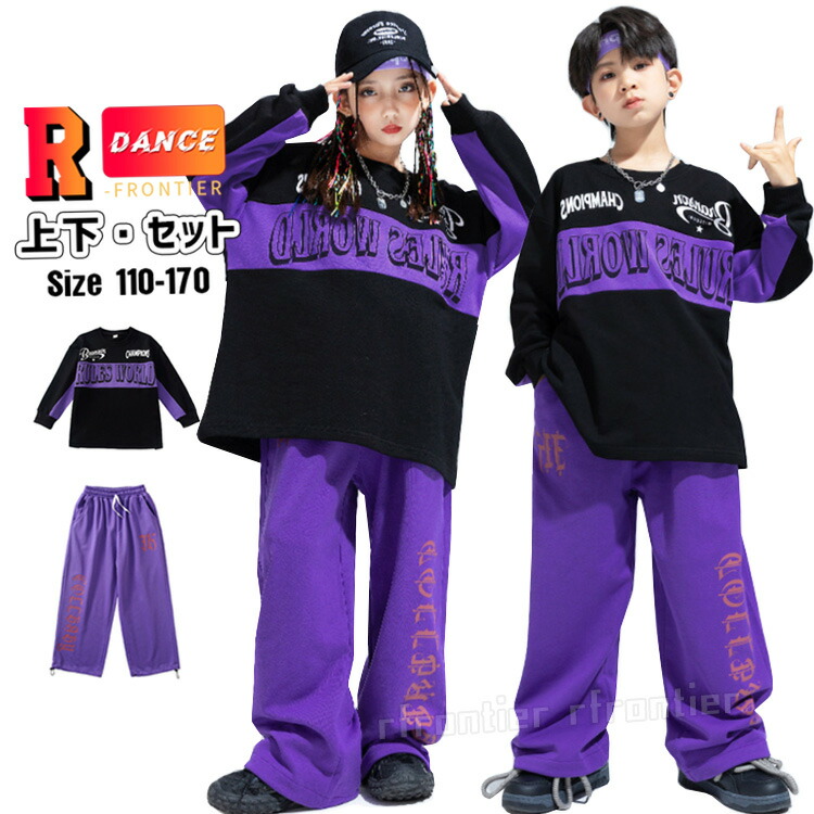 キッズ ダンス衣装 長袖 シャツ パープル ズボン ヒップホップ 団体 ダンス衣装 ジュニア イベント 発表会 演出服 応援団 110 170