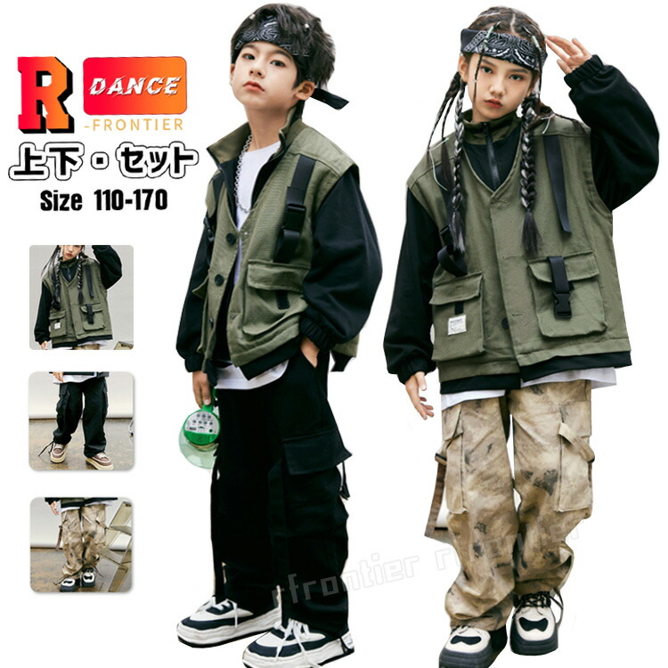 キッズ ダンス衣装 長袖 コート グリーン 黒 ズボン ヒップホップ 団体 HIPHOP ダンス衣装 ジュニア イベント 発表会 演出服 応援団 110 170