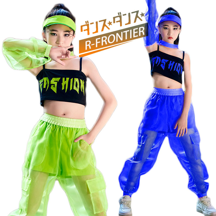ダンス衣装 ヒップホップ キッズ 緑 かっこいい セットアップ へそ出し トップス 女の子 青パンツ 韓国 k-pop衣装 団体 HIPHOP 演出服 中学生 イベント 120 130 140 150