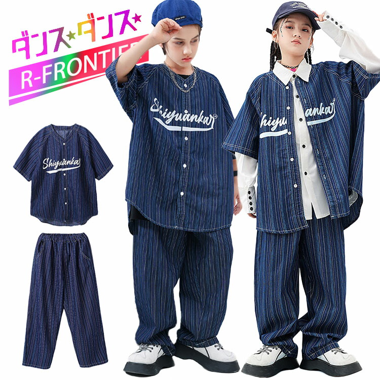 キッズ ダンス衣装 デニムセット デニムパンツ 韓国 半袖 長ズボン 縞柄 ヒップホップ トップス ズボン 子供 男の子 女の子 ステージ衣装 団体服 発表会 演出服