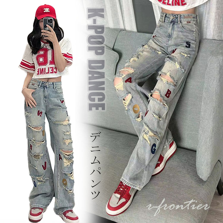 kpop衣装 レディース デニムパンツ ダメージ デニム オシャレ ワイドパンツ カジュアル 韓国 ファッション 大きいサイズ S-3XL