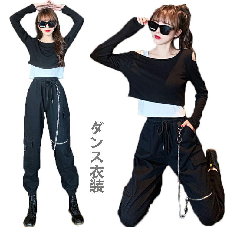 ダンス 衣装 ヒップホップ 上下セット 高校生 大人向け へそ出しシャツ+パンツ 長袖 イベント衣装 レッスン着にも最適 ロゴパンツ 黒 パンツ ホワイト HIPHOP