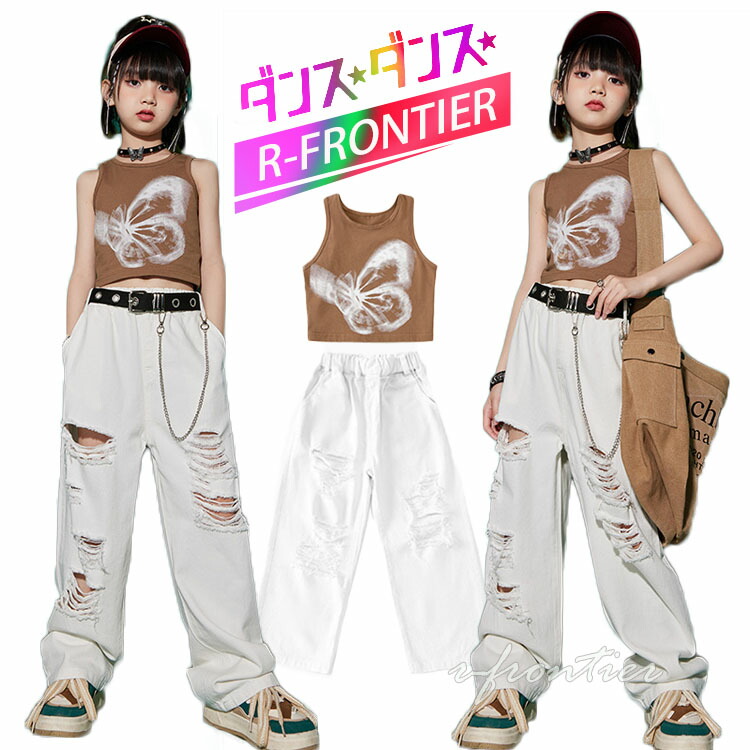キッズダンス衣装 へそ出し トップス ダンス衣装 カーキトップス デニムパンツ ダメージ パンツ ヒップホップ 団体 HIPHOP ダンス衣装 女の子 イベント 110 120 130 140 150